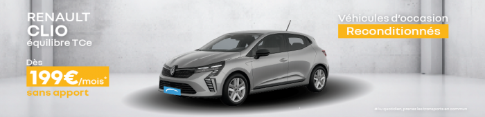 La présente offre commerciale concerne une sélection de véhicules d’occasion reconditionnés, notamment des Renault Clio Équilibre TCe 90 ch, proposés par BodemerAuto, SAS au capital de 28 777 470 euros, dont le siège social est situé à Saint-Brieuc, 48B rue du Port Favigo, 22000 SAINT-BRIEUC, immatriculée au RCS de Saint-Brieuc sous le numéro 808 260 426, dans le cadre d’une opération promotionnelle.